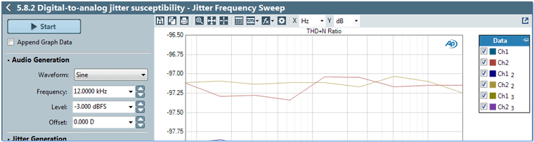 An example test of a Digital-to-Analog converter is shown below with a nested sweep of jitter frequency and audio frequency versus measured THD+N, according to the method specified by the AES-17 standard. For this particular converter, with a jitter amplitude of 40 ns, at a given audio frequency the jitter tolerance is unchanged as jitter frequency increases.