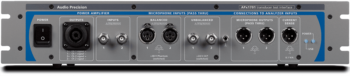 For electroacoustic test applications, the APx1701 Transducer Test Interface combines instrument-grade amplifiers and microphone power supplies for designers and production test engineers seeking clear insight into the behavior of loudspeakers, headphones and microphones. An acoustic test accessory, it is directly integrated with APx500 audio measurement software and requires an APx B Series analyzer.