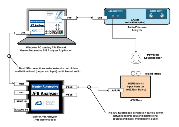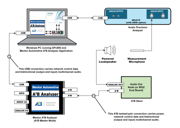 From simulation and bench testing in early-stage development, to validation and production testing, having a closed-loop system to measure audio and dynamic signal performance over an A2B network is an integral part of incorporating the bus technology into next-generation automotive systems. By combining the capabilities of Audio Precision’s APx500 audio analyzers and software, and Mentor’s A²B Analyzer System, software and ASIO driver, developers can easily create a complete, closed-loop multichannel A²B audio test system.
