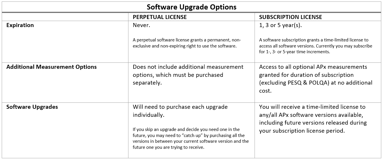 *The software subscription license provides access to all versions of software and all software options, except PESQ and POLQA, for the duration of the subscription.