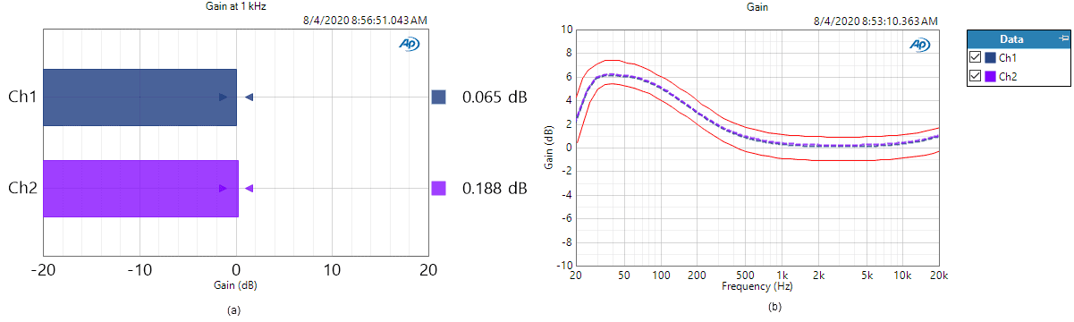 Primary Results in APx are the measurement results that are directly available. The most common types are “Meter” results and “XY” results. Meter results have a single value for each input channel and are represented in APx as a horizontal bar graph – for example, the Gain result in the single-frequency Level and Gain measurement (Figure 1a). XY results display curves of measured values versus an independent variable such as frequency or time – for example, the Gain (versus frequency) result in the Frequency Response measurement (Figure 1b). A third (and less common) result type in APx is the “Tabular” result, which provides a table of values – for example, the Thiele-Small Parameter result in the Impedance measurement. In Sequence Mode measurements, all Primary results are available when a measurement is first added to the project. In Bench Mode, typically only one or two of the most common Primary Results are present, and more can be added, if required.