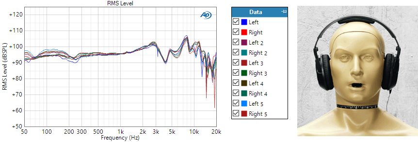 To illustrate Derived Results, we’ll use the test case of measuring the frequency response of headphones on a test fixture called a Head and Torso Simulator (HATS). Figure 1 shows RMS Level versus frequency data for five appended measurements of the same pair of headphones on a HATS, with the headphones being removed and replaced on the fixture for each measurement repetition. This procedure, which is a form of “spatial averaging”, is a recommended practice when testing headphones. The measured response varies significantly with the position of the headphones on the fixture due to the interaction of the earphones with the fixture’s pinnae (outer ears). To compensate for this variation, we measure several data sets with the headphones being re-fit on the fixture and then average the results. In addition to spatial averaging, there are other metrics we can calculate from this data set. This is where the Derived Results capability comes into play.