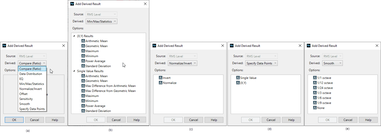 The Derived control in the Add Derived Result dialog is a pulldown menu containing a list of Derived Results that can be derived from the selected Source result. This list is context sensitive. For example, the Smooth derived result is available for an XY Source result, but not for a Meter result. Some Derived Results, when selected, present an additional menu in the Options box. For example, Figures 1 (b) through (e) show the Options presented for Min/Max Statistics, Normalize/Invert, Specify Data Points and Smooth, respectively.