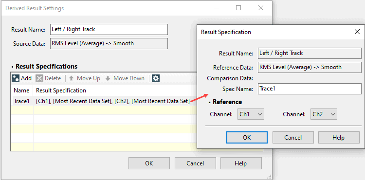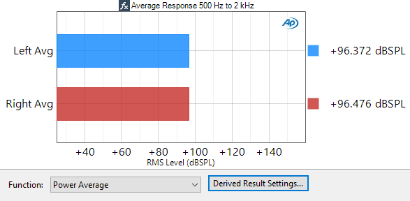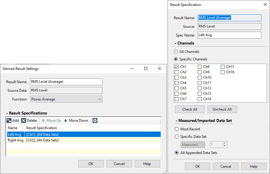 Returning to the headphone measurement data, Figure 4 shows spatial average data for the left and right earphones. In this case a Power Average (XY) derived result has been added, derived from the RMS Level result in Figure 2. The result has two Result Specifications, as shown in Figure 5; one for the trace labeled “Left Avg”, which averages all data sets for Ch1 and one for the “Right Avg” trace, which averages all data sets for Ch2.
