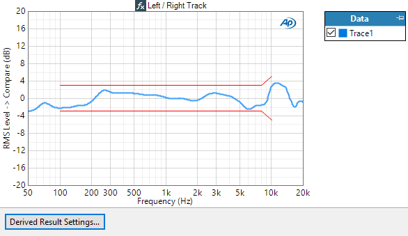 An important attribute of higher quality headphones is how well the frequency response of the left and right earphones match. We can easily quantify this by adding a Compare Derived Result derived from the spatial average data sets in Figure 4. This yields the Left/Right Track graph in Figure 6, which indicates, that for these headphones, the left and right earphones are within about ±3 dB from 100 Hz to 8 kHz (a perfect match would yield a flat line at 0 dB). As shown in Figure 7, this result was created by deriving a Compare result which compares the Ch2 averaged curve to the Ch1 averaged curve. Note that the Compare result was derived from a Smooth result, derived in turn from a Power Average result, derived in turn from an RMS Level primary result. Any number of Derived Results can be chained together like this.