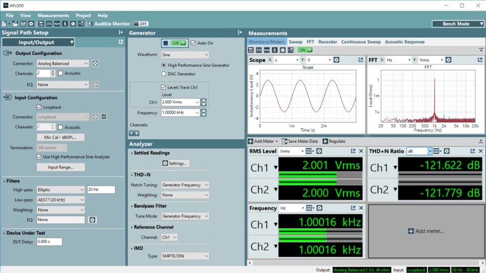 We added Bench Mode later. The goal of Bench Mode is to support power users accustomed to having complete control of the measurement hardware, who just want to start the software and immediately get to work. (Little known fact: before we settled on the name “Bench Mode” we initially referred to this as “immediate mode.”) While Bench Mode and Sequence Mode are basically equivalent in terms of measurement functionality, in some cases people have noted subtle differences in measurement results (for example, the THD+N results displayed above are for the same device measured in both Sequence Mode and Bench Mode). Why is that?