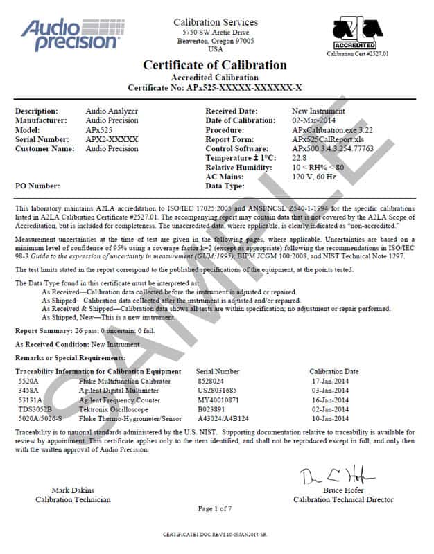 As to what this means to our customers, it means independent technical experts have confirmed that the Audio Precision calibration laboratory has been examined, audited, and found to operate according to ISO 17025 and has the capability to consistently issue technically valid and accurate calibration reports.