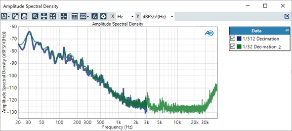 Output of a PDM microphone @ 3.072 MHz bitrate. At 1/512 decimation, only 3 kHz bandwidth is available (blue trace). At 1/32 decimation (green trace), 96 kHz of bandwidth is available. Note the rise in the noise floor starting just below 30 kHz. This is the noise shaping of the sigma-delta modulator in the microphone.