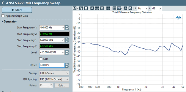 Audio Precision analyzers have had a variety of built-in intermodulation distortion (IMD) measurements since the System One was first introduced over 35 years ago. However, the IMD measurements specified in ANSI/ASA S3.22 and IEC 60118-0 are slightly different from the IMD measurements typically used for audio test. Both standards call for a type of IMD measurement known as Difference Frequency Distortion (DFD) with a difference frequency of 125 Hz. However, specifications such as the swept frequency range, distortion products included and results displayed are slightly different between the two standards and also different from other DFD measurements already included in the APx500 software. Accordingly, we have added two new measurements to Sequence Mode in APx, named “ANSI S3.22 IMD Frequency Sweep” (Figure 4) and “IEC 60118-0 IMD Frequency Sweep” (Figure 5).