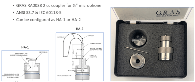 The acoustic input and output nature of hearing aids does offer some challenges. To measure hearing aid output, a special 2 cc acoustic coupler (like the one shown in Figure 1) is required, with a pressure-response measurement microphone. The audio analyzer must also be able to account for the microphone sensitivity, and to display measurement results in acoustic units (Pa or dBSPL).