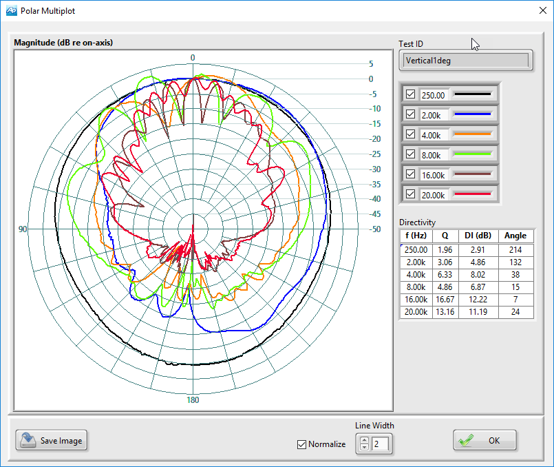 A polar plot usually displays the normalized response of a speaker or microphone versus measurement angle at one specific frequency. In a multi-plot view such as the one shown in Figure 1, each trace represents a different frequency. This is useful in that it allows you to see the directivity effects. For example, from the plot in Figure 1, it’s easy to tell that this speaker is more or less omnidirectional at 250 Hz, and its response becomes increasingly directional at higher frequencies. The disadvantage of a multi-plot, however, is that it’s difficult to examine more than a few frequency slices at a time. Even with 6 frequency slices, the plot in Figure 1 is quite “busy”.