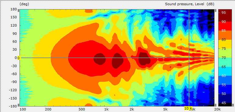 A contour plot has the advantage that it displays the directivity information for all frequencies simultaneously. Figure 2 is a contour plot of the same loudspeaker polar measurement data plotted in Figure 1. The horizontal axis represents frequency over the entire measurement range (100 Hz to 20 kHz in this case) and the vertical axis represents the measurement angle over a 360-degree range centered on the zero-degree (on-axis) position. In a contour plot, level is represented by color, with the color map shown to the right of the plot. This presentation makes it very easy to see the how the directivity of the device changes with frequency.