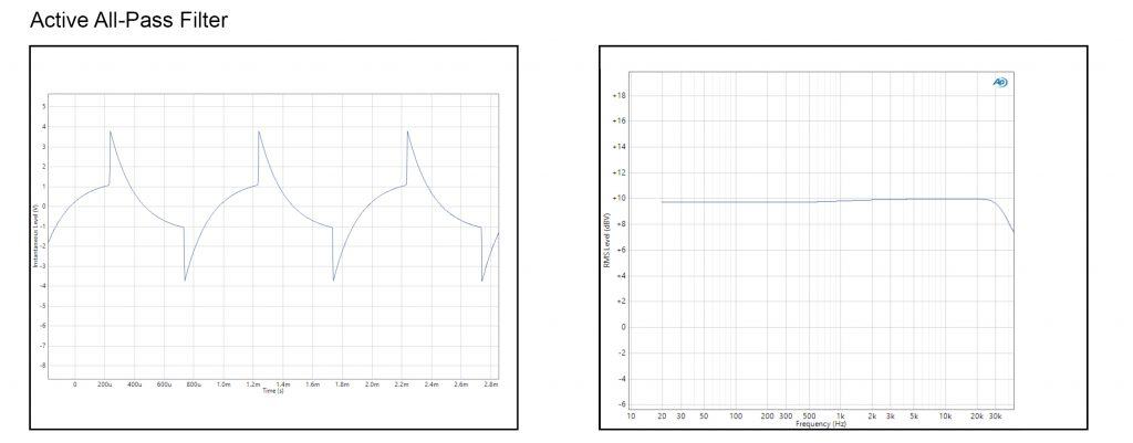 The Active All-Pass filter (below) is a case where the frequency domain looks reasonable and doesn’t indicate that anything unusual is happening with the response. However, looking at this in the time domain shows that the phase is shifting 180 degrees through each cycle.