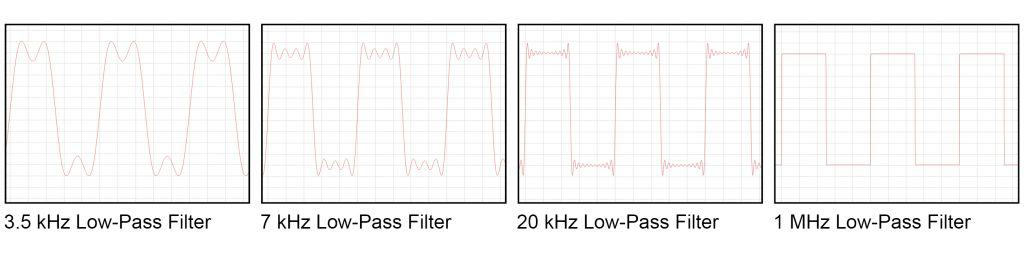 The shape of the square wave depends on the number of odd harmonics that are generated and how accurately they are produced in both frequency and amplitude. The “squareness” of the signal is improved with the addition of more odd harmonics. We can easily see the effects of more odd harmonics on this 1 kHz square wave simply by varying the bandwidth of the analyzer acquisition channel. Here is an example: