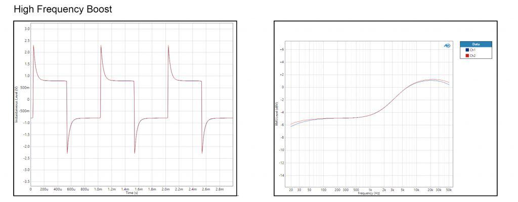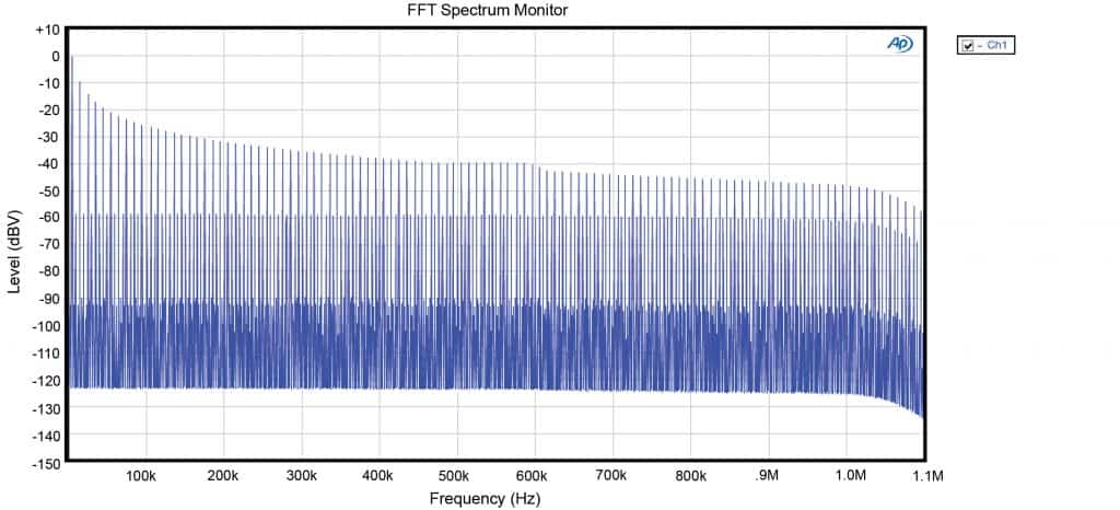 The BW52 option complements the high performance of the AG52 square wave. Its 1 MHz bandwidth keeps the square wave perfectly square, so that we can be sure any defects seen are in the DUT, and aren’t artifacts of the audio analyzer itself. The 1 million point FFT and 24-bit A/D conversion allow extremely detailed analysis unobscured by noise.