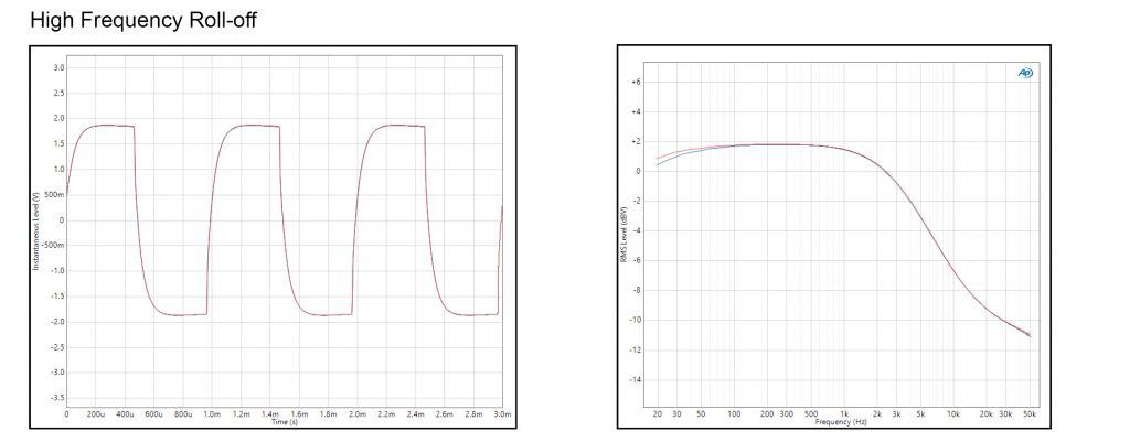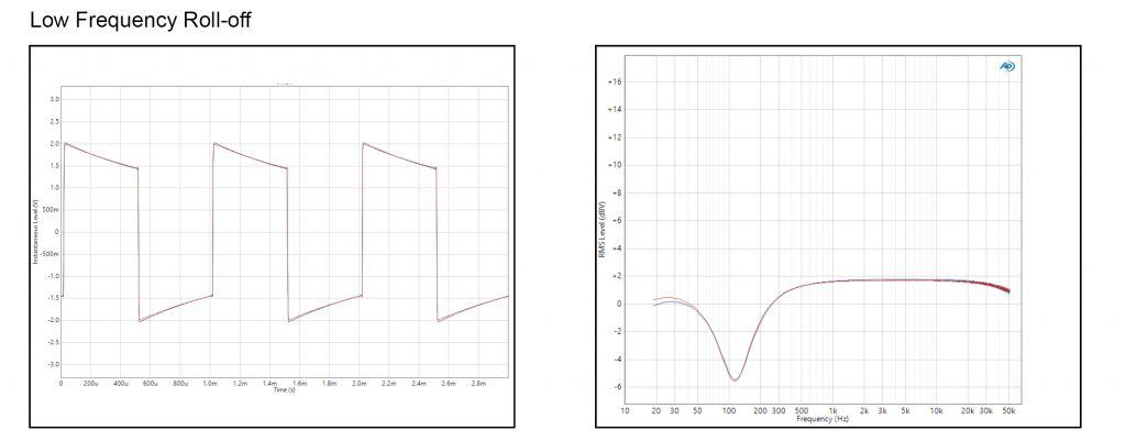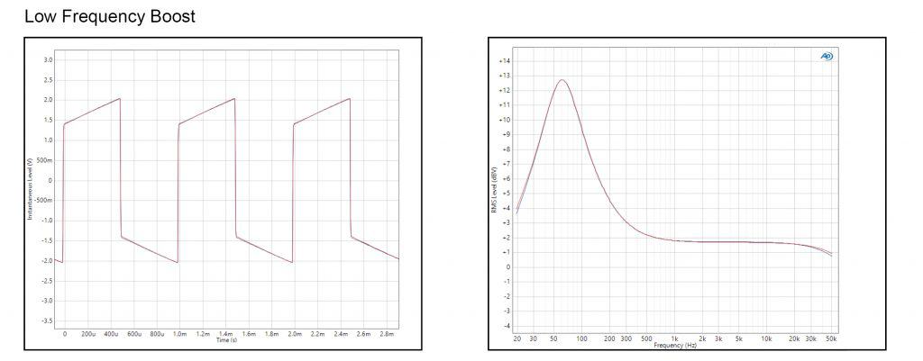 As I commented in my blog on Slew Rate & Rise Time Measurements, with square waves the edges are where the higher frequencies exist and the flat portions of the top and bottom are where the low frequencies exist (DC if the top and bottom are completely flat). This is why the high frequency roll-off and high frequency boost show their effects primarily at the edges (shown below), while the low frequency roll-off and low frequency boost show their effects primarily on the tops and bottoms of the cycles, leaving the edges mostly undisturbed (also shown below).