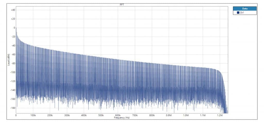 Let’s look at a frequency domain view of a square wave produced by a high quality 15 MHz function generator. This function generator is a good choice for many applications, but not for audio, where the extremely high dynamic range (about 144 dB for 24-bit) requires the purest signal possible.