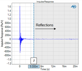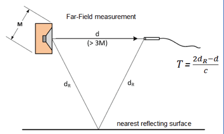 The direct sound travels distance d from the DUT to the microphone in Figure 1, but there is also a reflection from the nearest surface (floor, ceiling or wall) that travels distance 2dR. The difference in time of arrival between the direct sound and the closest reflection is
