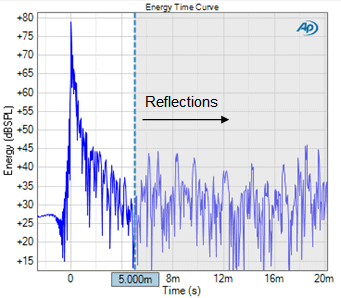 Reflections are visible as small impulses that occur sometime after the main impulse. They are typically difficult to see in the Impulse Response (Figure 2), but quite prominent in the Energy Time Curve (Figure 3). The Energy Time Curve represents the envelope of energy contained in the impulse response, with its magnitude expressed on a decibel scale. For example, in Figure 3 there are several small secondary peaks beginning at about 6 ms after the main impulse, which are indicative of reflections.
