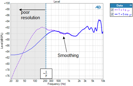 Figure 4 shows the RMS Level results for a loudspeaker tested in an anechoic chamber with the time window set at 5 ms (blue trace) and 1.0 s (magenta trace). The time window cursor and shading in Figure 4 correspond to T = 5 ms or 1/T = 200 Hz).The shading is intended to indicate that the RMS Level result is inaccurate below frequency 1/T (200 Hz in this case). But note that this is just an approximation. As shown, the windowed response is off by about 2 dB right at 200 Hz and it is only very close to the true response from about 400 Hz and above. Also, the smoothing effect of the windowing extends much higher in frequency – up to about 1 kHz.