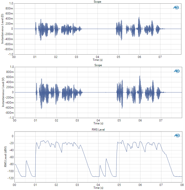 The relationship between the Generator Level control and the generated level is less straightforward for arbitrary waveforms. For example, consider the speech waveform in Figure 1 – one of the POLQA speech waveform files installed with the APx software (POLQA-F1-S1-48k.wav). The top graph shows the .wav file contents scaled from -1.0 to +1.0 D, as measured using Input Connector = File (Digital Units). The middle graph represents the signal acquired in analog loopback by loading the .wav file into the generator and generating it with the Level set to 1.0 Vrms. The bottom graph is the RMS Level versus time of this signal, recorded in Bench Mode at a rate of 250 readings per second. As shown, the rms level varies from about -115 dBV (the noise floor) to -13 dBV, with the active speech parts of the waveform at a level of about -25 dBV. An estimate of the overall rms level of the acquired signal can easily be obtained using an RMS derived result, derived from the RMS Level versus time result (i.e., Add Derived Result – Min/Max Statistics – Single Value – RMS). For the waveform in Figure 1, the resulting overall rms value is -23.085 dBFS.