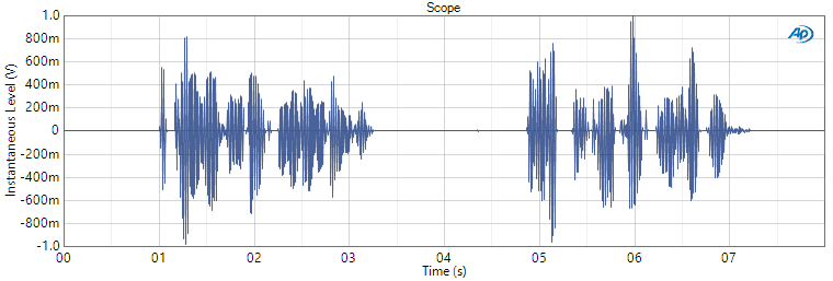 This is easy to demonstrate if the audio file contains a pure sine signal at a known level. For example, consider the Reference Level .wav files created by the APx Waveform Generator Utility. This utility can be used to create a variety of .wav files that are useful for audio test, including a set of files labeled “Reference Level” containing a 997 Hz sine wave at levels of 0, -1, -3, -20 and -60 dBFS. With the APx Generator Level set to 0 dBV (1.0 Vrms), if the 0 dBFS waveform is loaded and selected, the level generated will be exactly 0 dBV (1.0 Vrms). Similarly, if the -20 dBFS waveform is loaded and selected, a Generator Level setting of 0 dBV will result in a generated signal level of -20 dBV (0.10 Vrms). And so on for the other .wav files in this set.