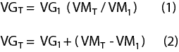 4. Calculate the Generator Level (VGT) required to achieve the target measured level (VMT) using equation (1), below, for levels expressed in linear units (Vrms or FS, etc.) or equation (2) for levels expressed in dB units (dBV or dBFS, etc.)