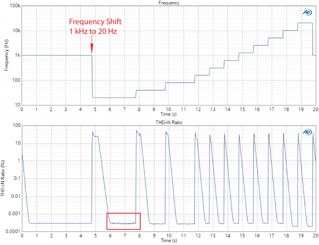 Testing an audio device usually involves stimulating it with a high-quality signal, often a sine wave, then measuring the quality of the signal that comes out of the Device under Test (DUT). Whenever the stimulus signal changes in frequency or amplitude, signal transients can be introduced by one or more in-circuit components (e.g., the DUT itself, the signal generator, the analyzer input section, etc.). To make good, repeatable audio measurements, we need to ensure that audio quality metrics are captured under steady state conditions, once these transients have dissipated and the meters have settled.