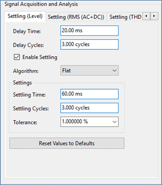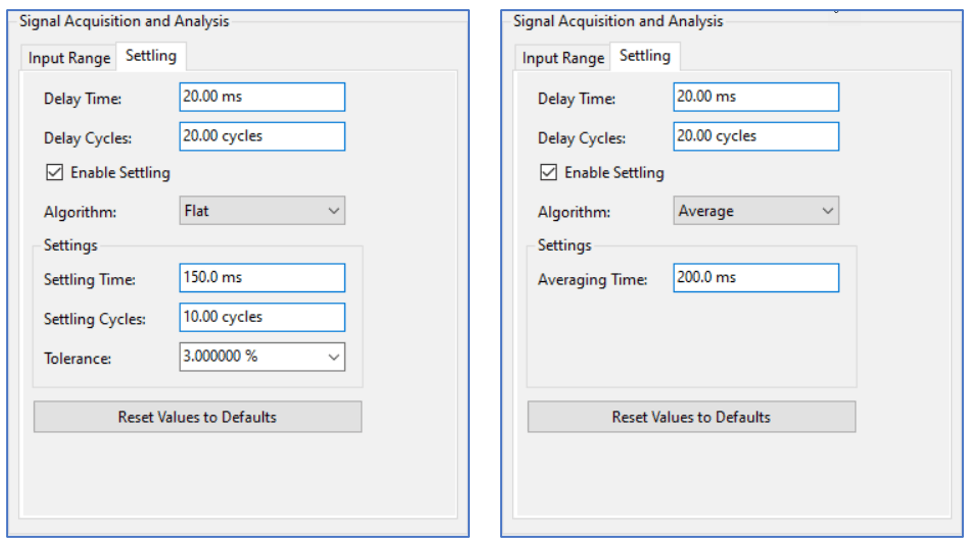 In Sequence Mode, each measurement has its own settling parameters. Settling controls are located on the Settling tab(s) of the Signal Acquisition and Analysis dialog, which is opened by clicking the “Advanced Settings…” button below the Analyzer section in the measurement’s configuration pane. For example, Figure 3 shows the THD+N measurement’s settling parameters for the two settling algorithms available in Sequence Mode: Flat and Average. Note the Enable Settling checkbox, which is used to select whether settling is enabled (default) or disabled.