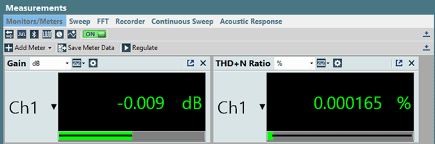 Figure 1. The Monitors/ Meters measurement in Bench Mode showing an RMS Level and THD+N Ratio meter.