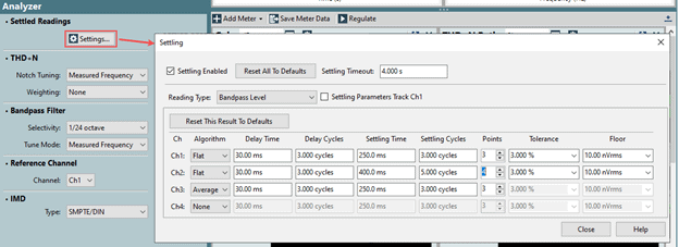 In Bench Mode’s Sweep measurement, results display settled readings when Settling has been enabled (the default setting). Settling parameters in Bench Mode are accessible via the Settling dialog, invoked by clicking the Settings button in the Settled Readings section at the top of the Analyzer pane (Figure 2). Figure 2 illustrates settling parameters for an analyzer with four analog input channels.