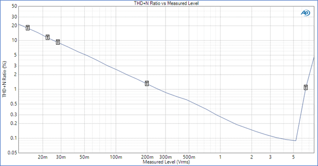 Figure 3. A THD+N Ratio versus Measured Level Sweep result of a power amplifier with timeout indicators at several level steps.