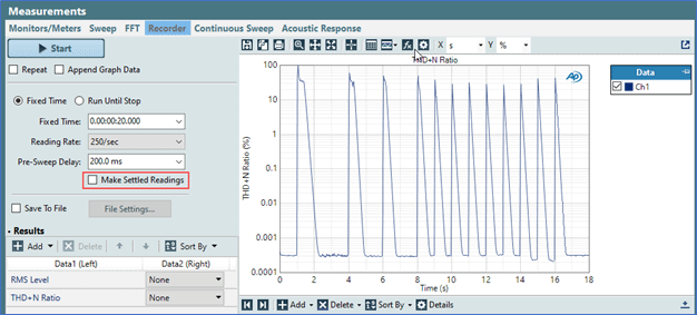 In the Recorder measurement, settling is disabled by default. It can be enabled by checking the Make Settled Readings checkbox in the Recorder measurement’s configuration pane (Figure 4). But, of course, this will drastically reduce the effective reading rate of the measurement.