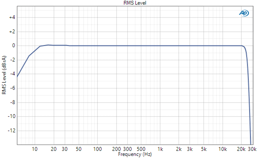 Full‑range frequency response measurements can be made by several different methods, the classic being a sweep of a sine wave from the lowest frequency in the range to the highest, the results plotted on a graph. A “flat” response describes the shape of a graph where the DUT responds equally at all frequencies, producing a trace with a slope of 0 and with minimal variations. Below is an example of a typical DUT flat frequency response curve.