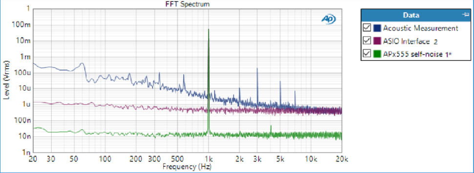 In short, while the APx555 has a self-noise 50 dB lower than the ASIO audio interface, the audio interface is still more than 30 dB quieter than the acoustic background noise. This provides more than enough headroom to make measurements on the speaker in question.