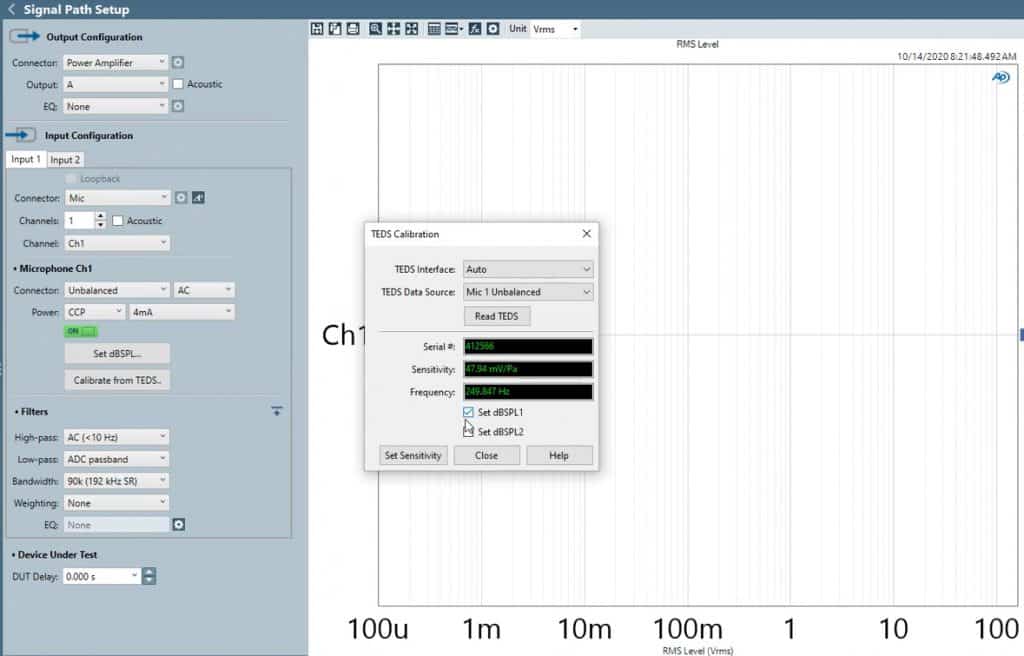 Reading TEDS data and setting measurement microphone sensitivity within APx500 audio measurement software.