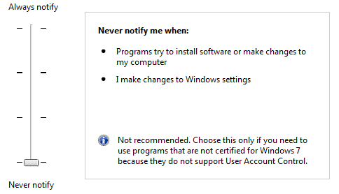Windows User Account Control is designed to notify you when software attempts to make changes to your computer. Changing the setting to “Never Notify” means that if you’re logged on as an administrator, programs can make changes to your computer without you knowing about it. If you're logged on as a standard user, any changes that require the permissions of an administrator will automatically be denied. Windows User Account Control protects your PC, along with Windows Firewall and other Internet security and anti-virus software. Disabling UAC may open up your computer to potential security risks.