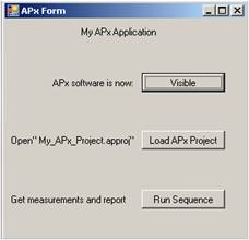 My objective is to create a simple application that opens the APx control software and has buttons to show or hide the APx GUI, open a specific APx Project file, and run the APx measurement sequence defined in the project.
