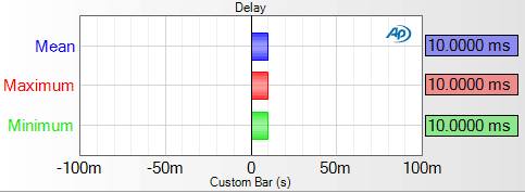 A controlled test file with a 10 ms audio delay is used in the following example. Figure 1 shows the Fast RMS result, displaying both the video and audio pulses. Figure 4 shows the Delay result. Because synchronization error isn’t constant on some devices, the mean, maximum, and minimum delay over the duration of the test are calculated.