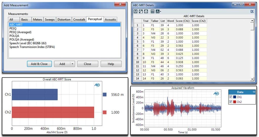 Using the ABC-MRT option allows developers to measure the speech intelligibility of their designs with AP’s industry-leading instrumentation and use that same equipment for the rest of their audio and electro-acoustic test requirements. Once installed, the ABC-MRT measurement can be easily incorporated into any test sequence.