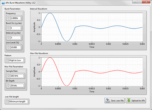 The utility provides control over the Burst Parameters, the Pattern, and the Wav File Parameters. The frequency setting is limited to frequencies that are synchronous at the selected sample rate. 192 kHz is set as the default rate in order to provide the greatest resolution. This can be reduced if you need to save .wav files at a lower sampling rate.