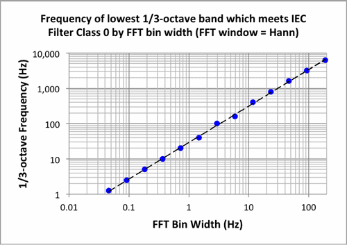 Note: The utility automatically limits the lowest fractional octave frequency based on the FFT length and an empirical relationship such as the one shown in Figure 2 (for the Hann window). This is done so that the lowest fractional octave bands displayed meet IEC Class 0 requirements . If you need a lower fractional octave frequency than the one displayed, (1) increase the FFT length, (2) lower the sample rate, or do both . Similarly, if you don’t need as low a frequency as displayed, you can decrease the FFT length to reduce the processing time. (Note that the time required to process the data increases linearly with the FFT length and the channel count.)