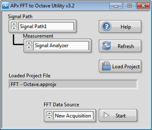 The utility has a few simple controls: In addition to the Refresh button, there is a Load Project button, to make it easy to load a different APx project file. The FFT Data Source control is used to select the source of the FFT data to be converted; the choices are: