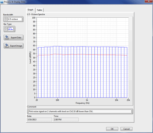 After selecting the FFT Data Source, click the Start button to acquire (if selected) and analyze the data. This launches the Process and Display Data window (Figure 4). (The graph in Figure 4 shows a 1/3-octave spectrum derived from an FFT of a pink noise signal generated on two channels with a 10 dB level difference between channels.)