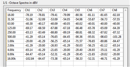 Figure 7. Table view of an 8-channel 1/3-octave analysis.