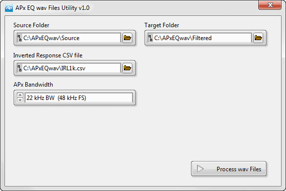 The utility includes both a GUI version and a command-line version. The GUI version has a simple interface for selecting the input file, the .csv file with the EQ curve, and an output file. Some sample .csv files are included with the utility as examples to show the proper format. The data export feature in APx will also create a properly formatted .csv files.
