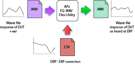 The APx .wav Files Equalization Utility can also be used to apply equalization to audio at the analyzer inputs before calculating measurement results (post EQ). This can be useful when utilizing an artificial ear or HATS (head and torso simulator). In some cases, it is necessary to convert the frequency response at the DRP (eardrum reference point), where the measurement microphone is located, to the response that would theoretically be measured in the free field. In this scenario, use the APx500 Measurement Recorder to first capture the acquisition to a .wav file. Then use the utility to create an equalized version, and load the equalized file into APx500 for analysis (Input Connector: File (Analog Units) or File (Digital Units)).