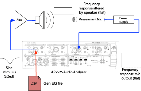 All the APx500 measurements for frequency response allow you to apply equalization to sine waves produced by the generator. The APx EQ .wav Files Utility lets you apply equalization to generator source .wav files as well.