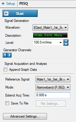 Fig 8 The APx PESQ measurement settings panel allows the generator waveform and the reference signal to be chosen independently.
