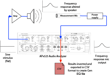 Fig 2 Using a flat sine stimulus to measure speaker deviations and create a compensating inverse EQ curve.